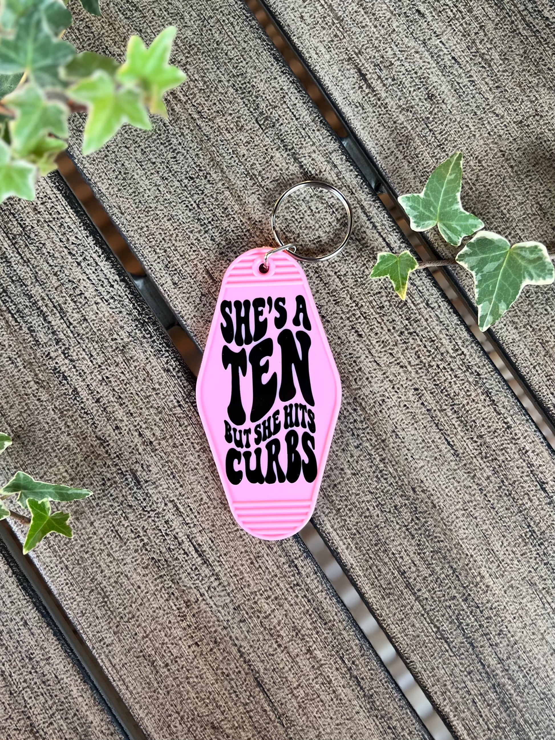 She Hits Curbs Motel Keychain